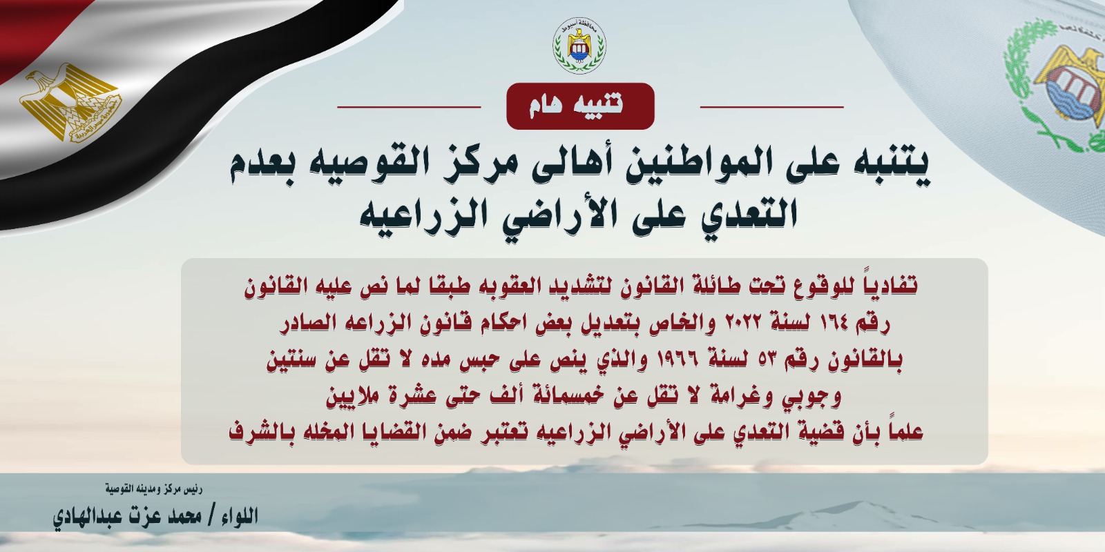 في اطار حرص الدولة علي تطبيق سيادة القانون وفي ظل زيادة حالات التعدي على الأراضي الزراعية في مركز القوصية، أصدر اللواء محمد عزت، رئيس مركز ومدينة القوصية، تحذيرًا قويًا للمواطنين وأهالي المركز بضرورة احترام حقوق المزارعين وعدم التعدي على الأراضي الزراعية. يأتي هذا التحذير في إطار جهود حماية الأراضي الزراعية والحفاظ على صمود قطاع الزراعة في المنطقة.