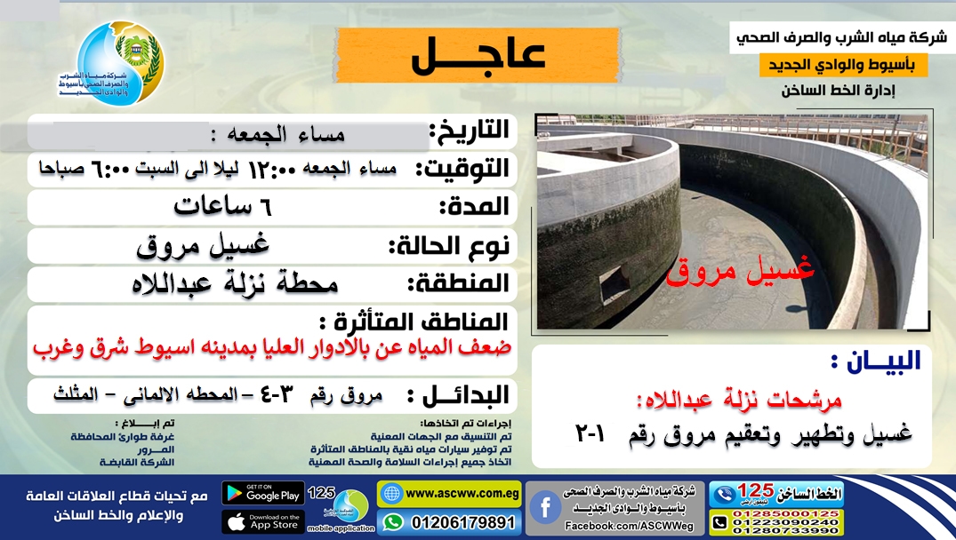 تنوه شركة مياه الشرب والصرف الصحى باسيوط والوادى الجديد السادة المواطنين عن حدوث ضعف المياه بالادوار العليا شرق وغرب مدينة أسيوط دون انقطاع المياه نتيجة غسيل وتطهير مروق 1 و 2 بمحطة نزلة عبداللاه المرشحة وتوفير بدائل مروق 3 و4 المحطة الألماني المثلث وذلك لمدة 6 ساعات من يوم الجمعة الساعة 12 مساءا وحتى السبت 6 صباحا