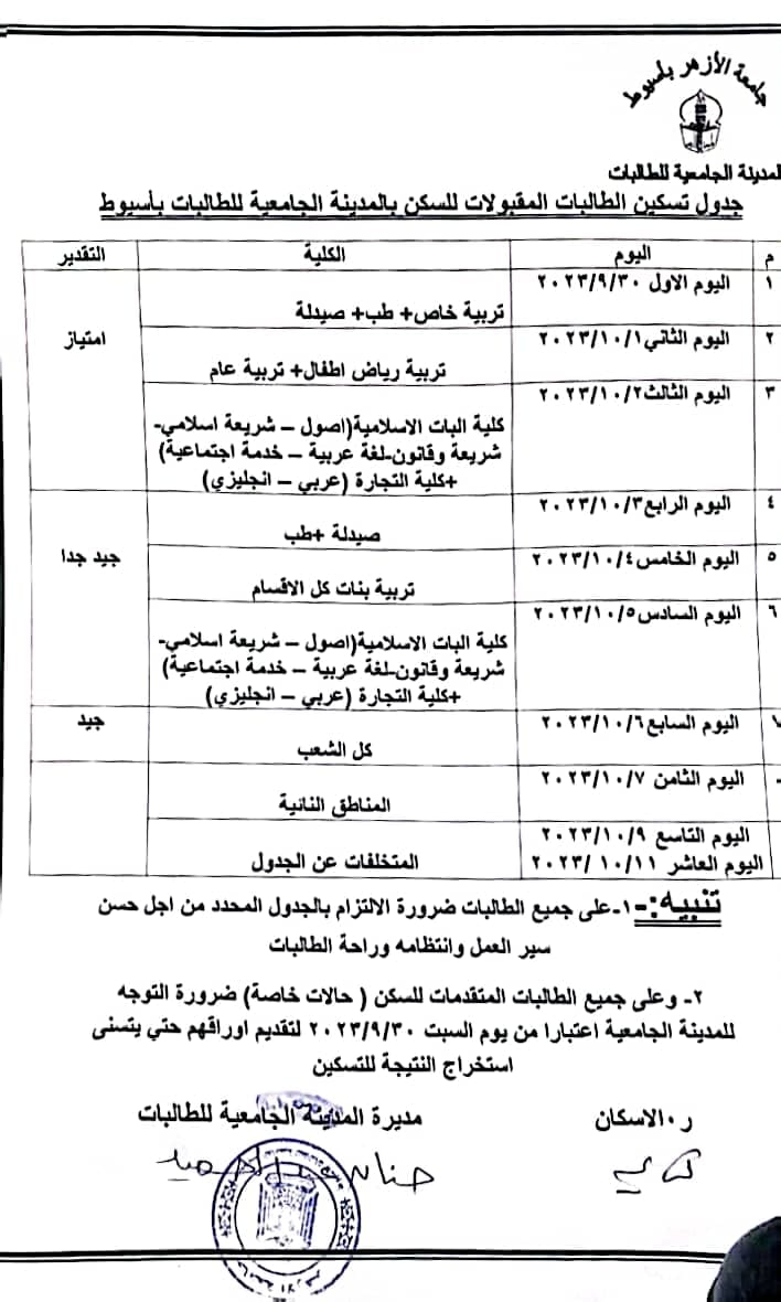 نتيجة لجهود المسئولين في جامعة الأزهر والتزام الطالبات بالإجراءات الصحية المتبعة، تم تسكين الطالبات في المدينة الجامعية للبنات بأسيوط بحسب الجدول المعلن بعد أن أحضرت كل طالبة 4 صور من إيصال فورى لمصروفات المدينة، نأمل من جميع الطالبات الامتثال للجدول المحدد لتجنب التكدس والزحام في المدينة الجامعية والحفاظ على سلامتهن وصحتهن، كما نشكر الجهود المبذولة من الإمام الأكبر، الدكتور أحمد الطيب، ورئيس الجامعة، الدكتور سلامة داوود، ونائب رئيس الجامعة للوجه القبلي، الدكتور محمد عبدالمالك، على دعمهم المستمر والتزامهم بسلامة الطلاب.