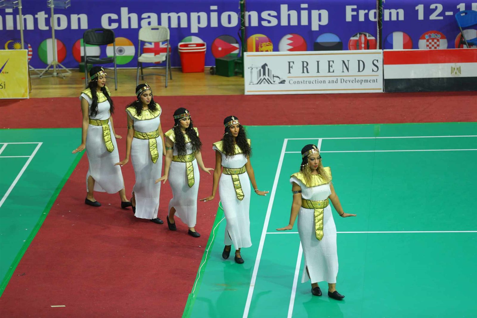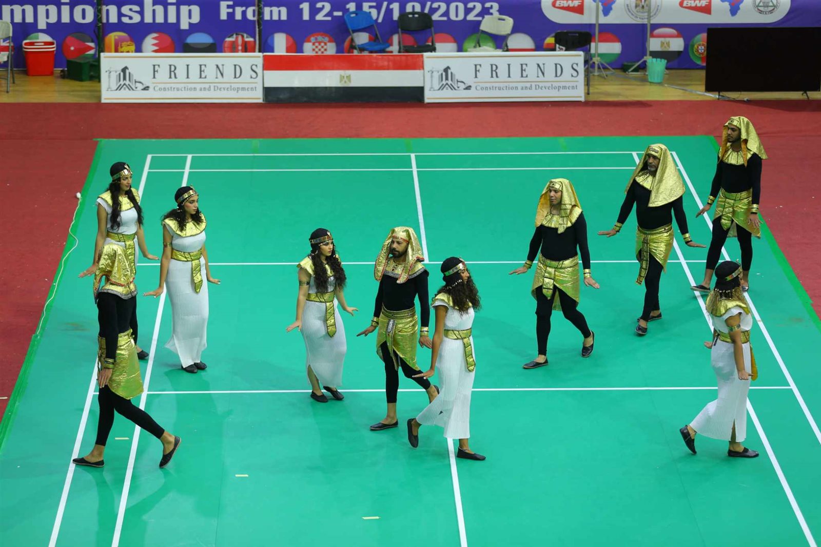 وبدأ حفل الافتتاح بالسلام الوطني ثم عرض فرعوني بسيط ثم استعراض طابور العرض للفرق المشاركة ثم كلمات للسادة الضيوف.
