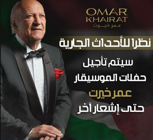 أعلنت نخبة كبير من نجوم الغناء والموسيقى توقف حفلاتهم خلال أكتوبر الجاري، وعلى رأسهم “عمر خيرت، محمد عبده، عمرو دياب، أنغام، وائل جسار، حسين الجسمي، رحمة رياض، تامر عاشور، بهاء سلطان، محمد عبده، نانسي عجرم” في عدد من البلدان العربية.
