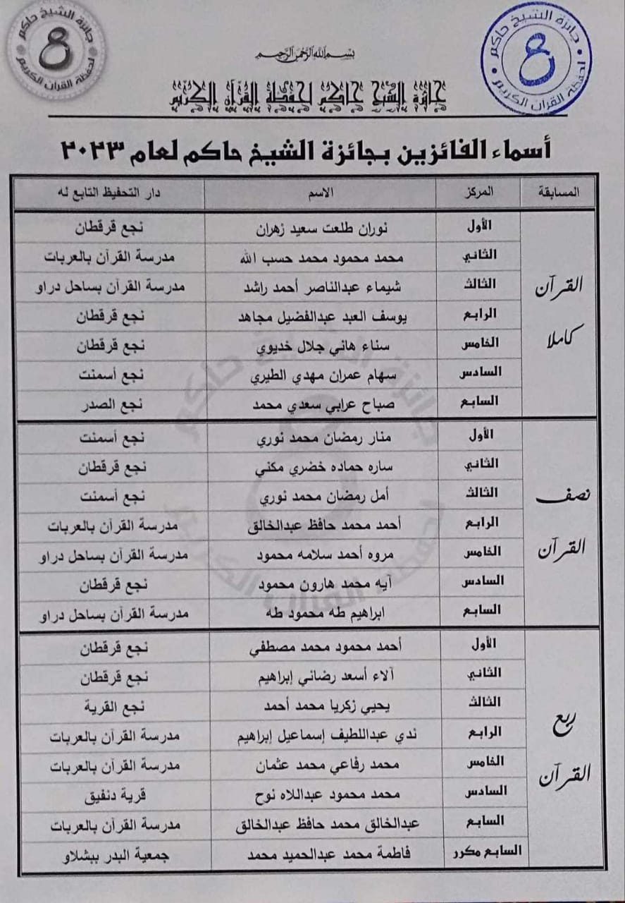 ننشر أسماء الفائزين فى مسابقة “الشيخ حاكم” لحفظ القرآن الكريم بقنا