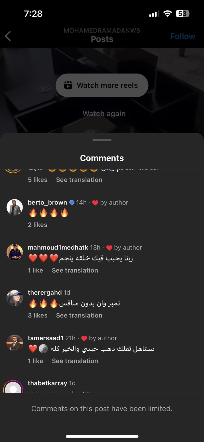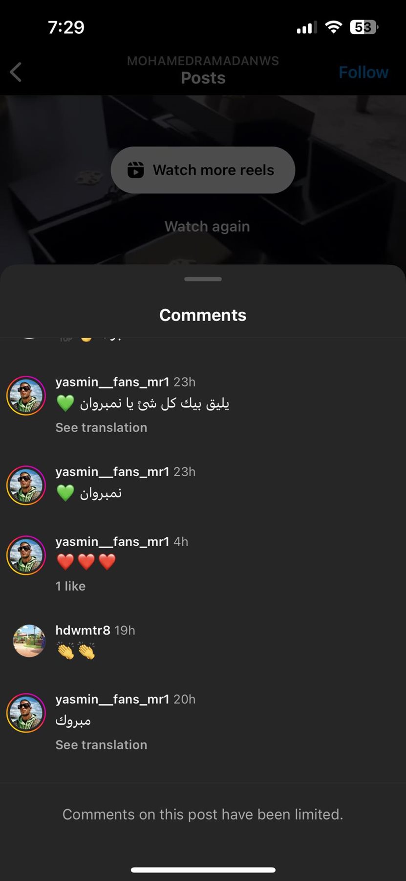 إلا أن هناك مجموعة من المتابعين الذين دعموا ودافعوا عنه وجاءت التعليقات كالأتي، "تستاهل كل خير يا فنان"، "ربنا يحبب فيك خلقه"، "تستاهل تقلك دهب حبيبي والخير كله"، "الأسطورة محمد رمضان"، "يليق بك كل شيء يا نمبروان".