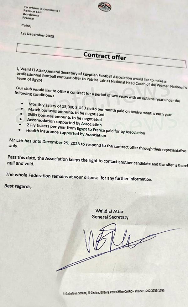 حصلت الوفد على نسخة من عرض اتحاد كرة القدم والذى أرسله الاتحاد قبل توقيع العقد للمدرب الفرنسي و المقدم عن طريق وليد العطار المدير التنفيذي لاتحاد كرة القدم