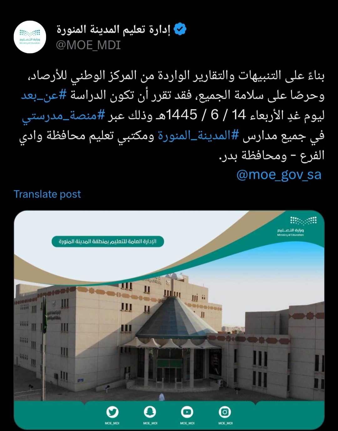 ولفتت ادارة تعليم المدينة المنورة عبر حسابها الرسمي بموقع التواصل الاجتماعي "X" تويتر سابقا، إلى أن العملية الدراسية ستكون مستمرةً عن بعد عبر منصة "مدرستي" لجميع الطلبة ومنسوبي ومنسوبات المدارس ومكاتب التعليم.
