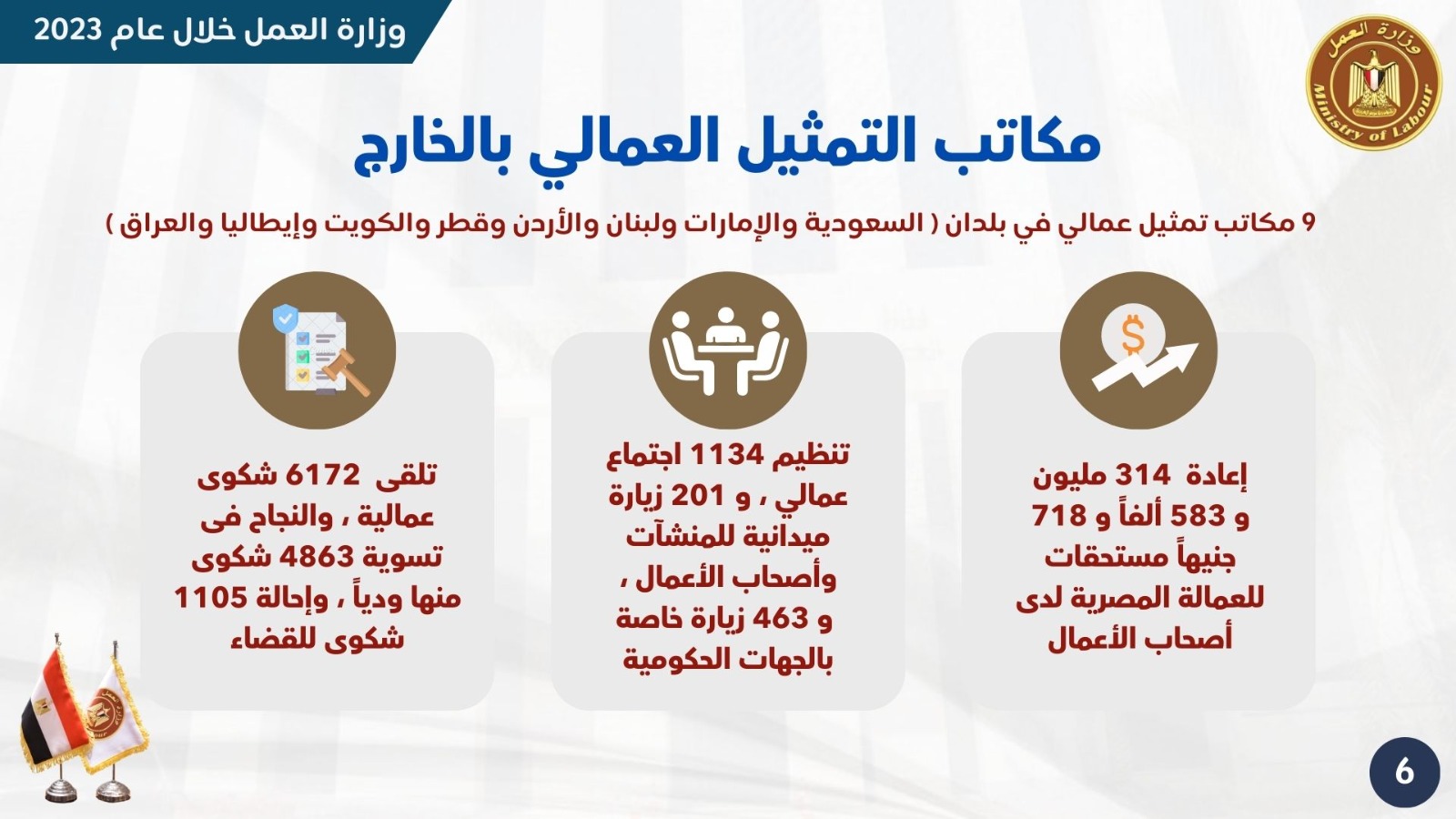 نجحت وزارة العمل خلال 2023، في إعادة مستحقات ما يقرب من 5 ملايين عامل مصري بالخارج، وذلك من خلال مكاتب التمثيل العمالي التابعة الوزارة في بلدان (السعودية والإمارات ولبنان والأردن وقطر والكويت وإيطاليا والعراق)، إذ تمكنت من إعادة حوال 314 مليون و 583 ألفًا و 718 جنيهًا مصريًا، مستحقات عمالة مصرية لدى أصحاب الأعمال.