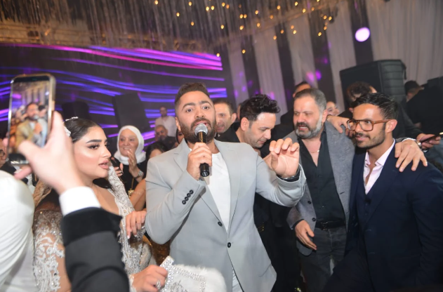وكان تألق النجم تامر حسني، في حفل الزفاف، وقدم العديد من أغانيه التي يحبها ويتفاعل معاها الجمهور على خشبة المسرح، كما غنى مع المطرب مصطفى قمر ديو لأغنية "حبيب حياتي"، وغنى أيضاً أغنية "كل مرة" وشاركه الغناء الفنان دياب.