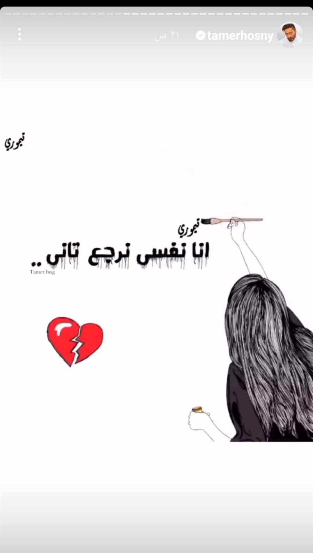 وشارك تامر عددًا من القصص المصورة ومن بينها مقطع من أغنية أنا نفسي نرجع تاني، وهو ما أثار حيرة جمهوره حول كونها رسالة غامضة لأم أولاده، وفي "ستوري" أخرى، ظهر فيه وهو يغني "يا وحشني"، وبعدها مقطع من أغنية "نسيانك صعب أد إيه إني أقدر عليه".
