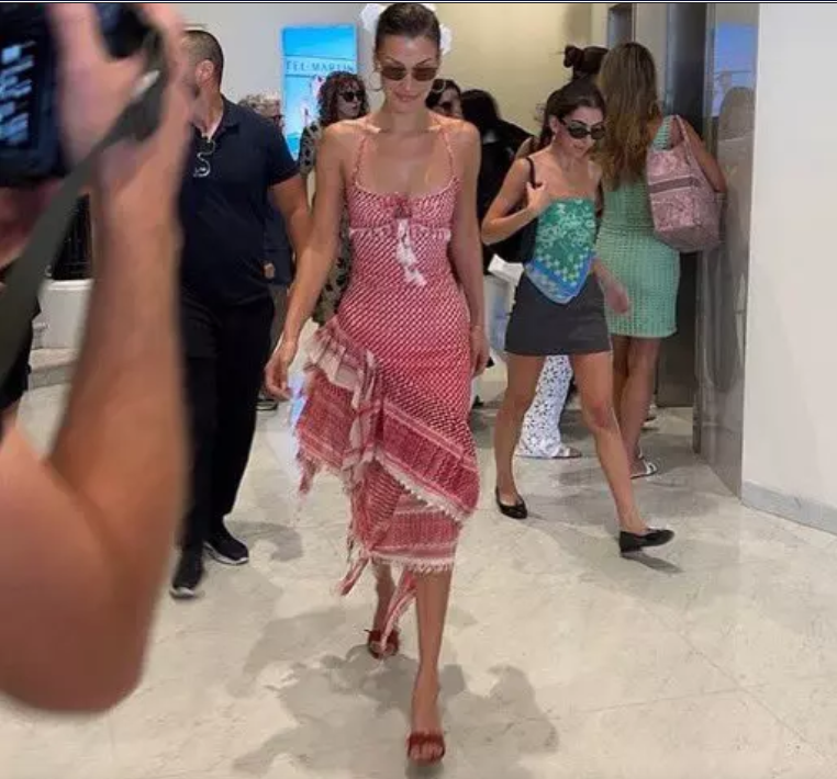 ارتدت عارضة الأزياء الشهيرة بيلا حديد فستان مستوحى من تفاصيل الكوفية الفلسطينية الشهيرة باللونين "الأحمر والأسود" والأبيض هو اللون المشترك بينهما، واعتمدت "حديد" اللون الأحمر لها