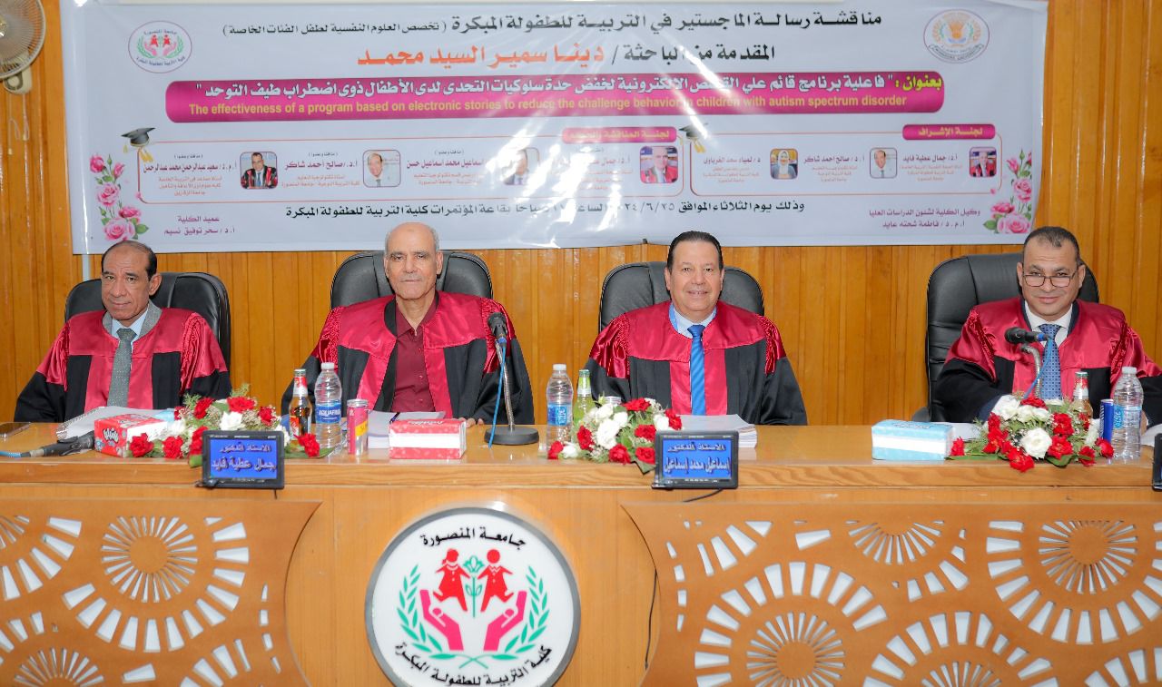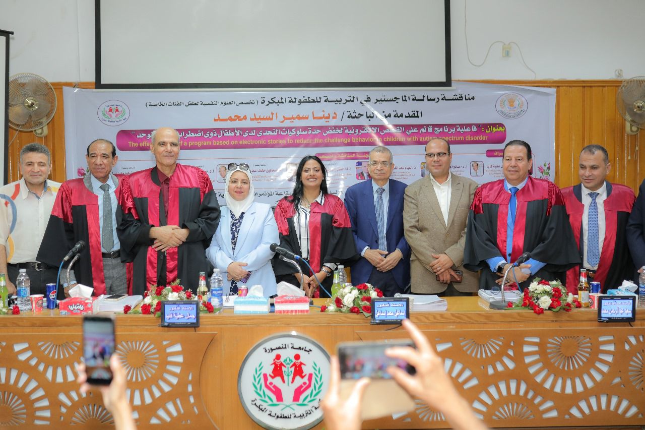 ناقشت، اليوم الثلاثاء، بكلية التربية للطفولة المبكرة جامعة المنصورة رسالة ماجستير بعنوان" فاعلية برنامج قائم علي القصص الإلكترونية، لخفض حدة سلوكيات التحدى لدى الأطفال ذوى اضطراب طيف التوحد، للباحثة دينا سمير السيد محمد "تخصص العلوم النفسية "لطفل الفئات الخاصة.