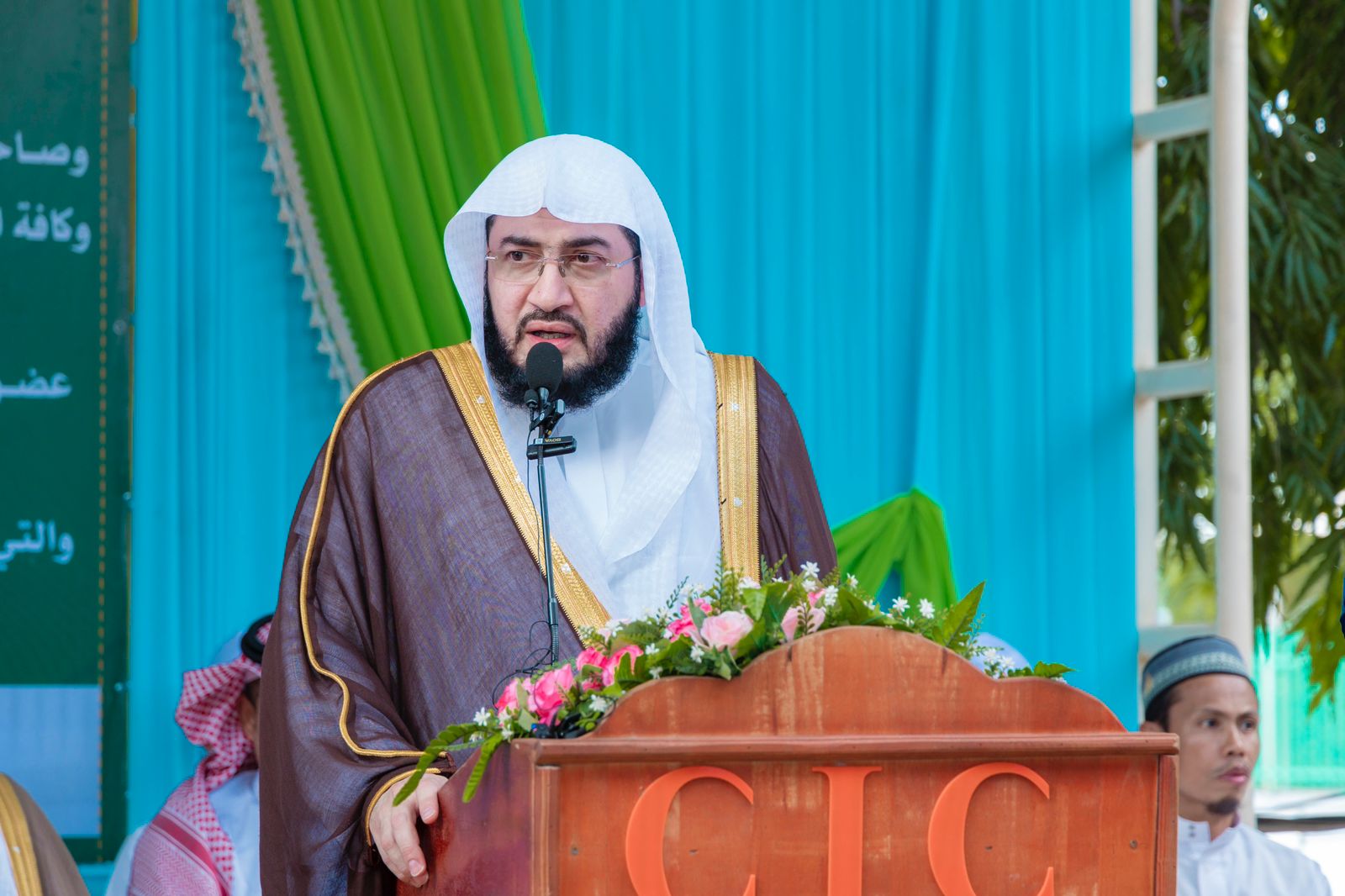 عقب ذلك حضر فضيلته حفل الاستقبال الكبير والبهيج الذي نظمه المركز احتفاءً بزيارته الرسمية بحضور أكثر من الف وخمس مئة طالب وطالبة، حيث بدأ بتلاوة آيات من الذكر الحكيم ثم ألقى مدير المركز الشيخ خليل موسى كلمة قدم الشكر للقيادة الرشيدة بالمملكة على اهتمامها بالمسلمين بالعالم وبأشقائهم بمملكة كمبوديا على وجه الخصوص، لافتاً إلى أهمية زيارة إمام الحرم المكي في ربط الشعب الكمبودي بعلماء المملكة للأخذ عنهم العلم الشرعي والاستفادة من توجيهاتهم ونصحهم .