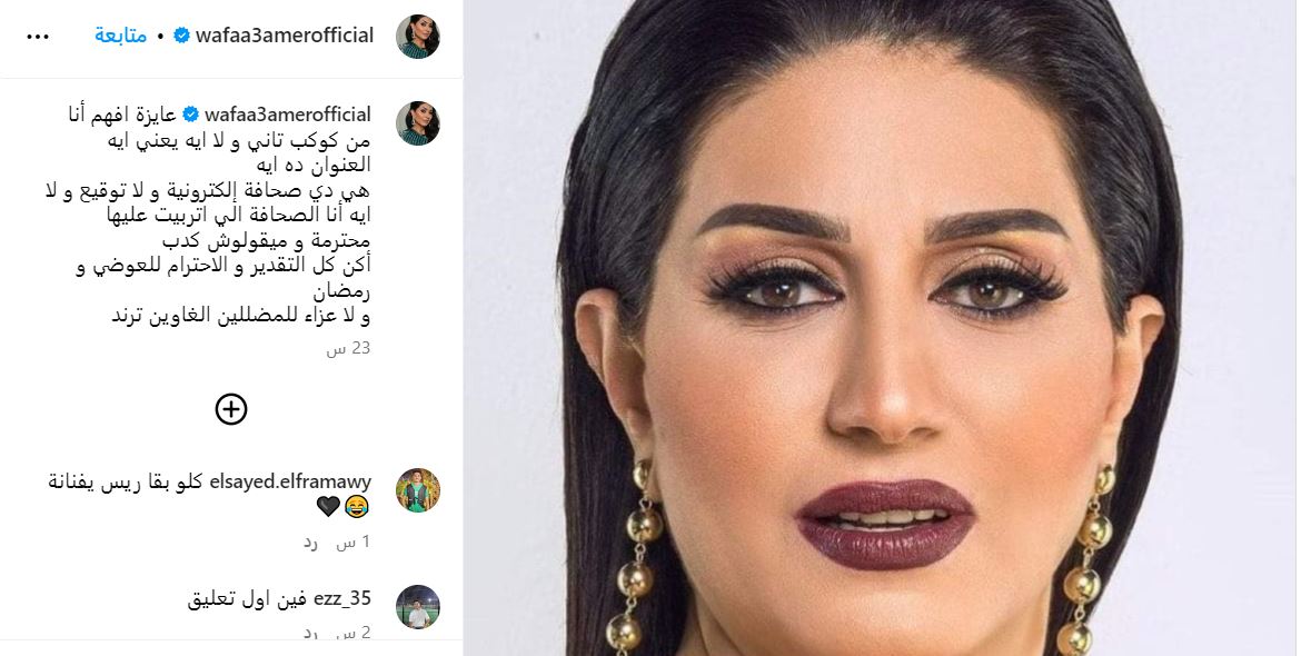 ونشرت وفاء صورة للخبر المتداول الذي عُنْوِن بـ"وفاء عامر تهين العوضي ومحمد رمضان وتفضحهما بالوقت نفسه.. شوفوا اللي قالته في أول تعليق"، وذاك عبر حسابها الشخصي على الإنستجرام.