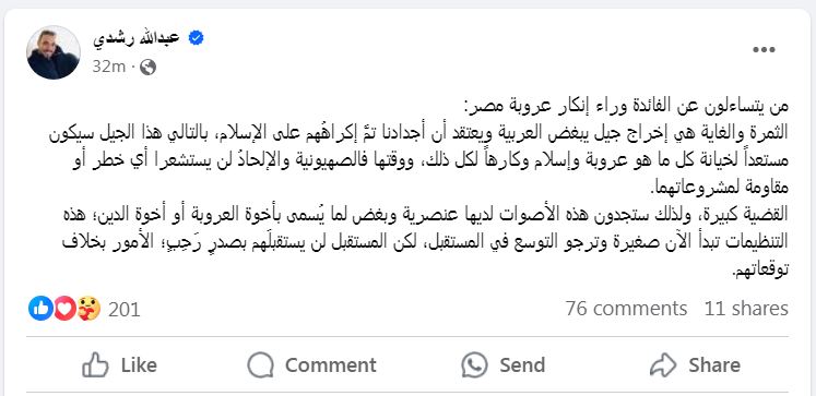 عبد الله رُشدي: السر وراء إنكار عروبة مصر هو إخراج جيل خائن