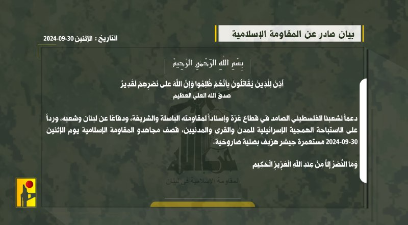 وقال حزب الله: دعماً لشعبنا الفلسطيني الصامد في قطاع غزة وإسناداً لمقاومته الباسلة والشريفة، ودفاعًا عن لبنان وشعبه، ورداً على الاستباحة الهمجية الإسرائيلية للمدن والقرى والمدنيين، قصف مجاهدو المقاومة الإسلامية يوم الإثنين 30-09-2024 مستعمرة جيشر هزيف بصلية صاروخية.