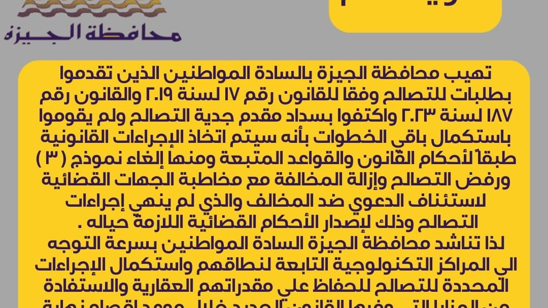 تهيب محافظة الجيزة بالمواطنين الذين تقدموا بطلبات للتصالح وفقا للقانون رقم 17 لسنة 2019 والقانون رقم 187 لسنة 2023 واكتفوا بسداد مقدم جدية التصالح ولم يقوموا باستكمال باقي الخطوات بأنه سيتم اتخاذ الإجراءات القانونية طبقاً لأحكام القانون والقواعد المتبعة ومنها إلغاء نموذج (3) ورفض التصالح وإزالة المخالفة مع مخاطبة الجهات القضائية لاستئناف الدعوي ضد المخالف والذي لم ينهي إجراءات التصالح وذلك لإصدار الأحكام القضائية اللازمة حياله.