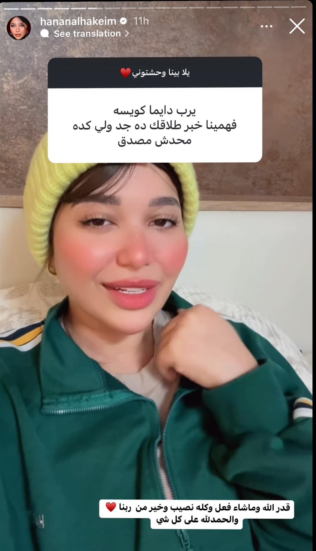 شارك زوجها "إيهاب محمد" تفاصيل الانفصال قائلاً: "قدر الله وما شاء فعل، تم الانفصال بيني وبين حنان بشكل نهائي. ربنا يقدم لها الخير ويتمم شفاها على خير، وتكون أحسن واحدة في الدنيا"، وتفاعل المتابعون بحزن مع هذا الخبر، متأثرين بما تمر به حنان من تحديات صحية، وعلّق البعض: "أكيد سابها عشان عندها سرطان، بس لو كان هو اللي تعبان مكنتش سابته أبداً"، ورأى البعض أن كل هذه المحنة سببها "الحسد".
