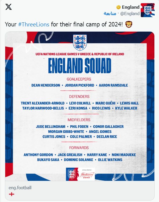 أعلن الجهاز الفني لمنتخب إنجلترا قائمة اللاعبين لمواجهتي اليونان وأيرلندا في دوري الأمم الأوروبية، خلال التوقف الدولي القادم للمنتخبات خلال أجندة فيفا في شهر نوفمبر الجاري.