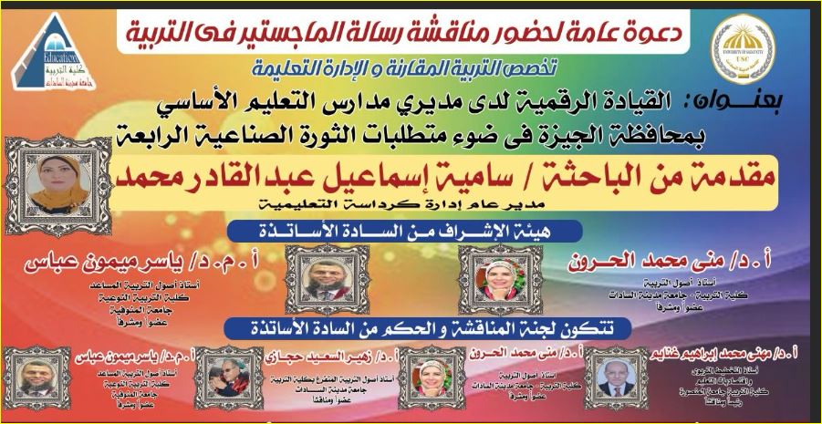 حصلت الباحثة سامية إسماعيل عبد القادر، مدير عام إدارة كرداسة التعليمية، على درجة الماجستير في التربية المقارنة والإدارة التعليمية، بكلية التربية جامعة مدينة السادات، عن رسالتها التي حملت عنوان «القيادة الرقمية لدى مديري مدارس التعليم الأساسي بمحافظة الجيزة في ضوء متطلبات الثورة الصناعية الرابعة».
