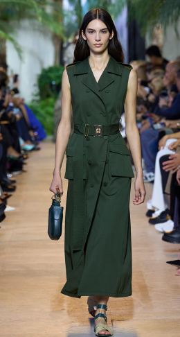 بخلاف الجيليه أو الـ Vestالذي يُرتدى كـ"توب" فوق البناطيل والتنانير، ستبرز هذا الموسم الفساتين المصممة على طراز المعطف الترنش، وسترينها في أغلب الأحيان من دون أكمام، كما في الموديل الأخضر الداكن المزود بأزرار على الجهتين من مجموعة المصمم إيلي صعب Elie Saab، الفستان الذي زُيّن بحزام عريض، نسق مع صندل قش مزود بإبزيم يزين الكاحل وحقيبة صغيرة من اللون نفسه.