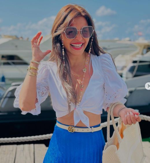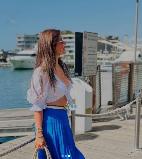 وبدت منة فضالي في أحدث ظهور لها بإطلالة صيفية مثيرة، مرتدية توب قصير مكشوف من الأمام كشف عن نحافة خصرها ونسقت معه بنطال طويل واسع ينتمي لقصة البليسية باللون الأزرق الزاهي.