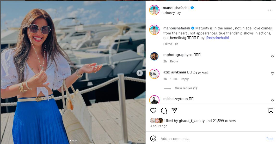 وعلقت على الصور، قائلة: " النضج في العقل وليس في العمر، والحب يأتي من القلب وليس المظاهر، والصداقة الحقيقية تظهر في الأفعال وليس في المصالح".