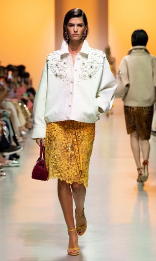 يأتي عيد الأضحى هذا العام في فصل الربيع، لذا قد تحتاجين في المساء إلى جاكيت خفيف ليكمل أناقتك، هنا نرشح لكِ الجاكيت الأبيض الواسع الذي رصدناه في عرض المصمم جورج حبيقة Georges Hobeika، التصميم المزين بورود بارزة على الكتفين، نسق بطريقة رائعة مع تنورة دانتيل صفراء تعلو الركبة، وانتعلت العارضة صندلًا ناعمًا من اللون نفسه، أما الحقيبة اختارتها باللون البرغندي، عززي جمال هذه الطلة بارتداء مجوهرات من الذهب الأبيض.