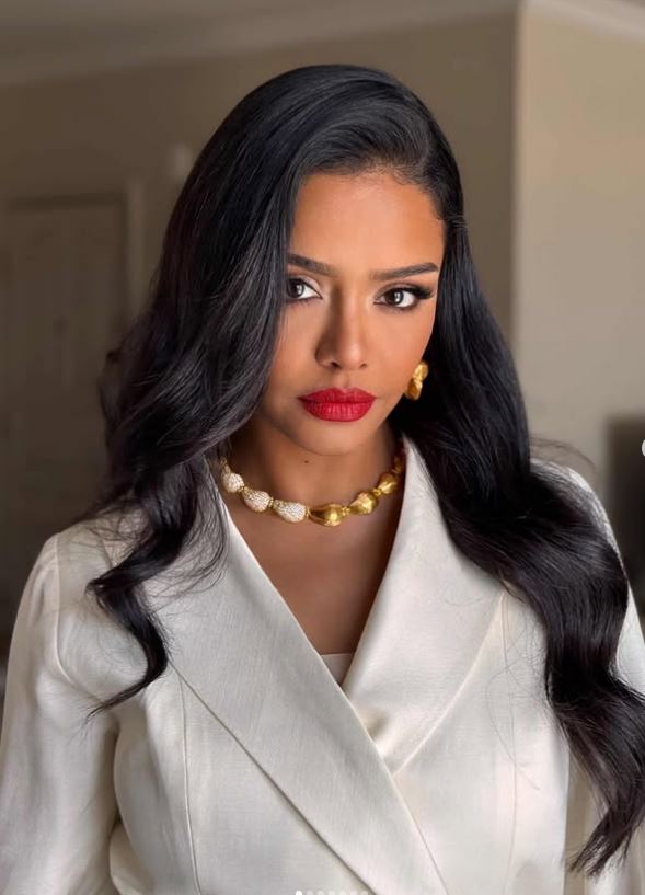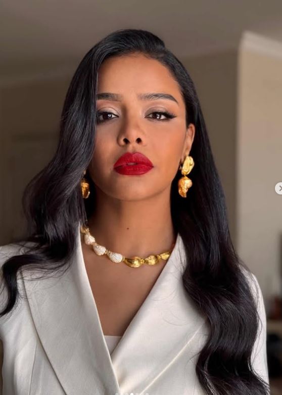 ومن الناحية الجمالية اعتمدت تسريحة شعر جذابة على طريقة الويفي الواسع ووضعت مكياجًا ناعمًا مرتكزًا على ألوان النود لتتناغم مع لون بشرتها السمراء مع لون الأحمر الصارخ في الشفاه.