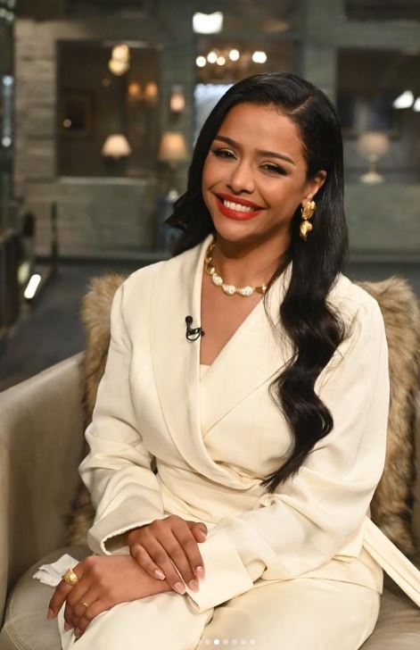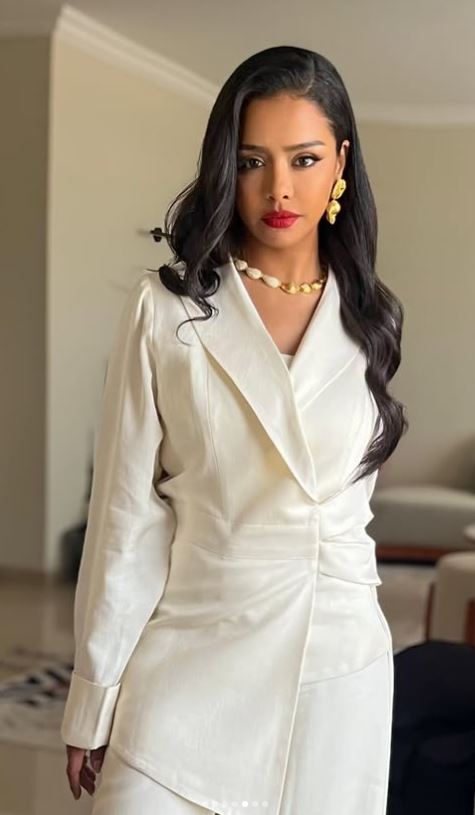 وبدت أسماء بإطلالة عصرية راقية مواكبة لأحدث صيحات موضة 2025، مرتديه بدلة نسائية مصممة بأسلوب هادئ وناعم من قماش الكريب باللون الأوف وايت.