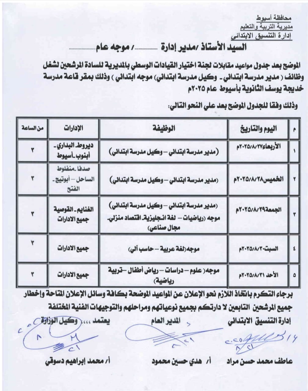 وكيل التعليم بأسيوط يعلن جدول مقابلات لجنة القيادات الوسطى