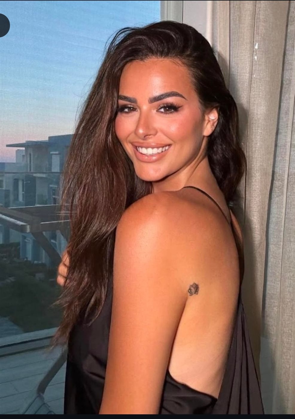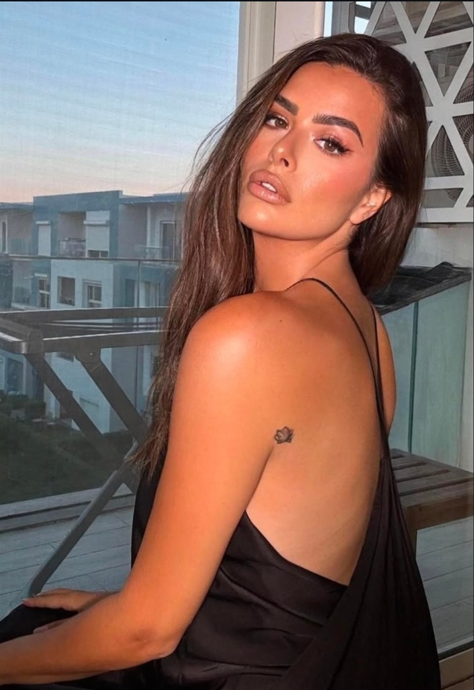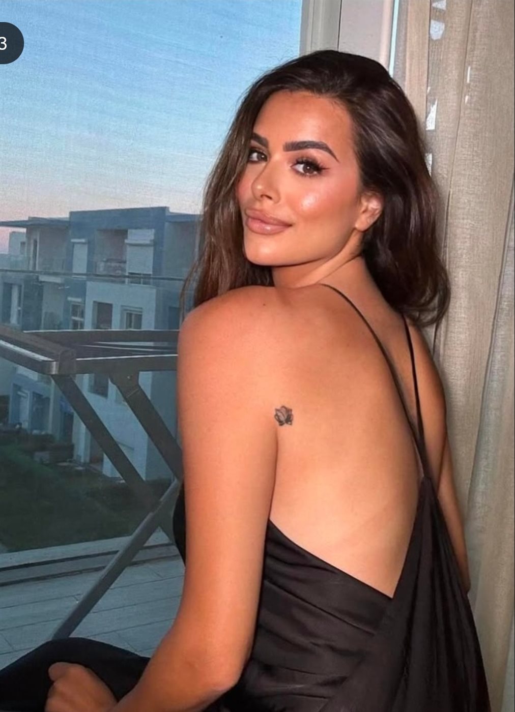 واختارت ترك خصلات شعرها مسندلة بشكل انسيابي وراء ظهرها ووضعت مكياجا جذابًا مرتكزا على الألوان الترابية مع تحديد عينيها بالكحل والماسكرا مع لون النود في الشفاه.