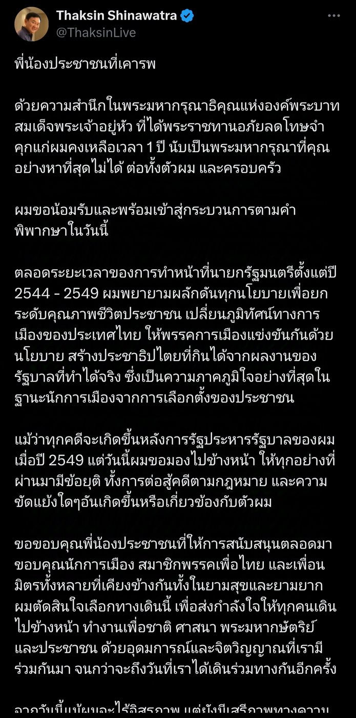 واختتم تاكسين حديثه قائلا "من اليوم، ورغم أنني لست حرا، فإنني لا أزال أتمتع بحرية الفكر لصالح الأمة والشعب"، مضيفا أنه سيقضي وقته في خدمة الملك والبلاد والشعب التايلاندي.