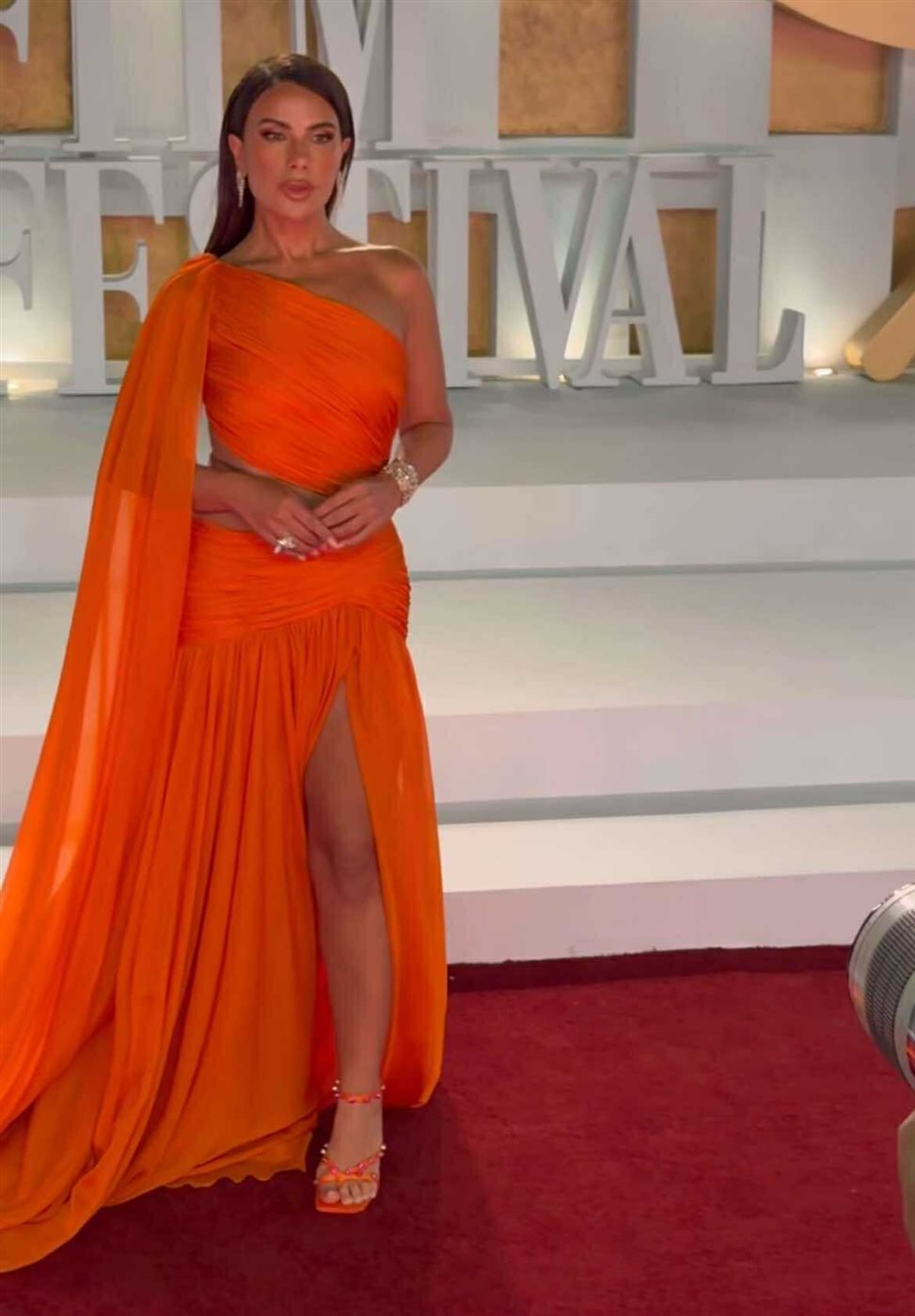 وتألقت صبا مبارك بإطلالة أنوثية متوهجة، مزجت بين الأنوثة و التمرد بشكل صريح ساحرة، ،مرتديه فستان طويل مجسم من أعلى وفضفاض من أسفل، اتسم بشق مثير من خصرها مع شق ثاني أيضا كشف عن أحد ساقيها صمم الفستان من قماش الشيفون باللون البرتقالي الزاهي لتكسر الروتين المعتاد وتعتمد موضه الألوان الصاخبة.